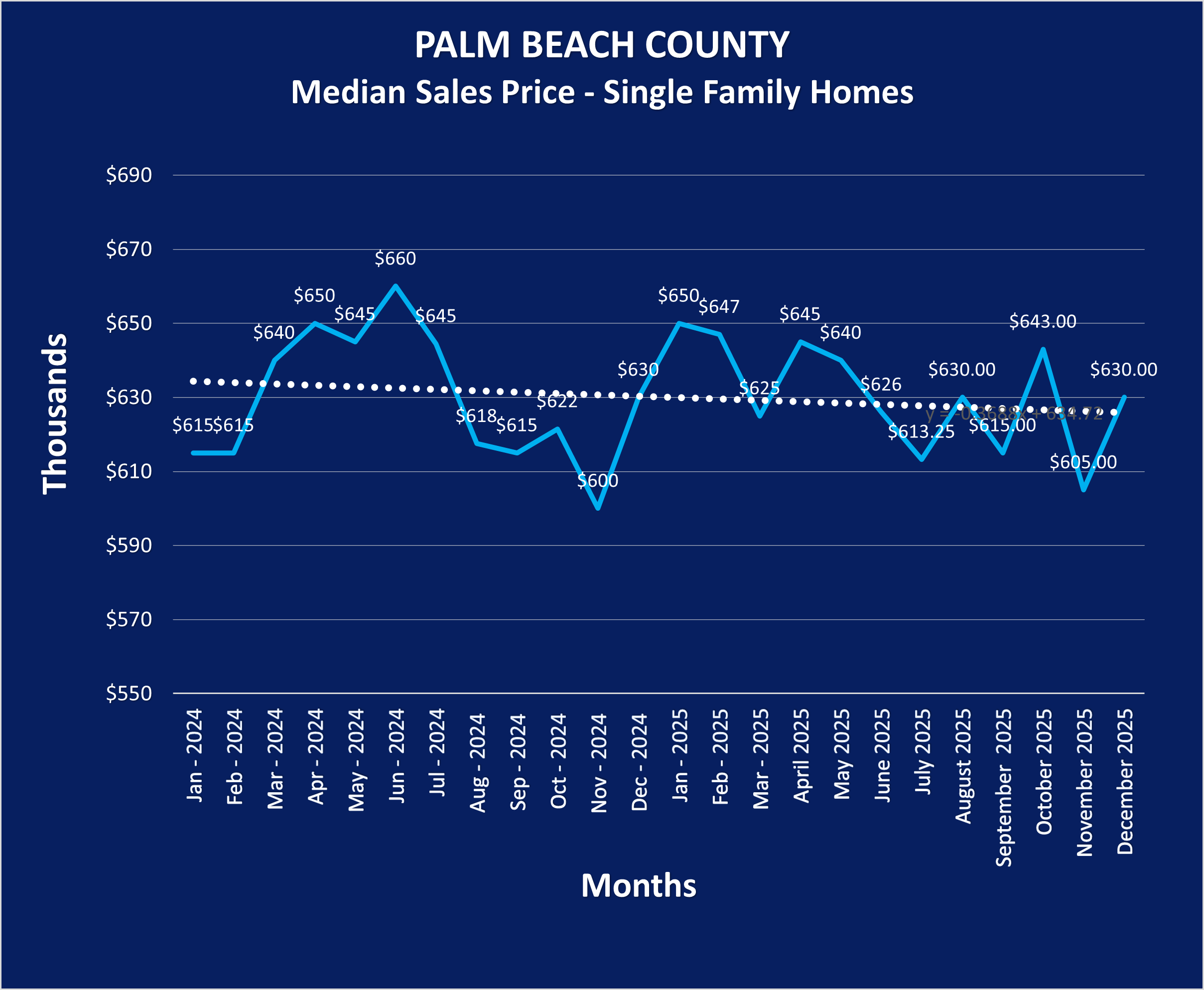 Over the last two years, the Palm Beach County real estate market has stayed active—but it’s definitely calmed down compared to the fast-paced frenzy we all remember. The big story for single-family homes is stability with a few ups and downs along the way. In early 2024, prices were sitting around $615,000, then climbed into the mid-$600,000s, peaking near $660,000 in June 2024. After that, prices cooled a bit and even dipped to about $600,000 in November 2024. In 2025, the market continued that same “wave” pattern—prices rose to around $650,000 in January, then floated mostly between $625,000 and $645,000 for much of the year, finishing around $630,000 in December 2025. What this tells us is simple: home values are holding up. Buyers are more careful and price-conscious, but the market hasn’t fallen apart—it’s just becoming more normal.