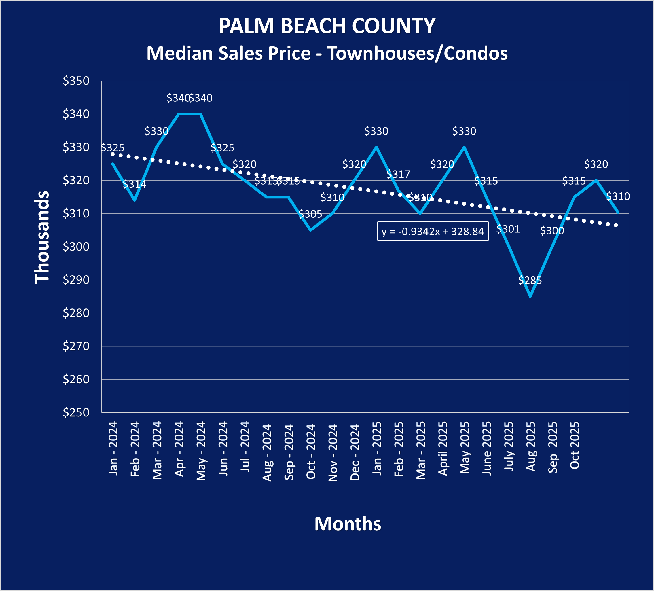 Condos and townhomes have followed a slightly different path. Prices have been more uneven and, overall, a bit softer than the single-family market. In early 2024, the median price was around $325,000, rising to about $340,000 in the spring (April–May). Later in 2024, prices drifted back down into the low $300,000s, bottoming near $305,000. In 2025, we saw a couple of rebounds—touching $330,000 in January and again in May—but then prices dropped to the lowest point of the period at about $285,000 in August 2025, before recovering into the $300,000–$320,000 range and ending around $310,000. This part of the market seems more sensitive to affordability, competition, and monthly payment concerns.